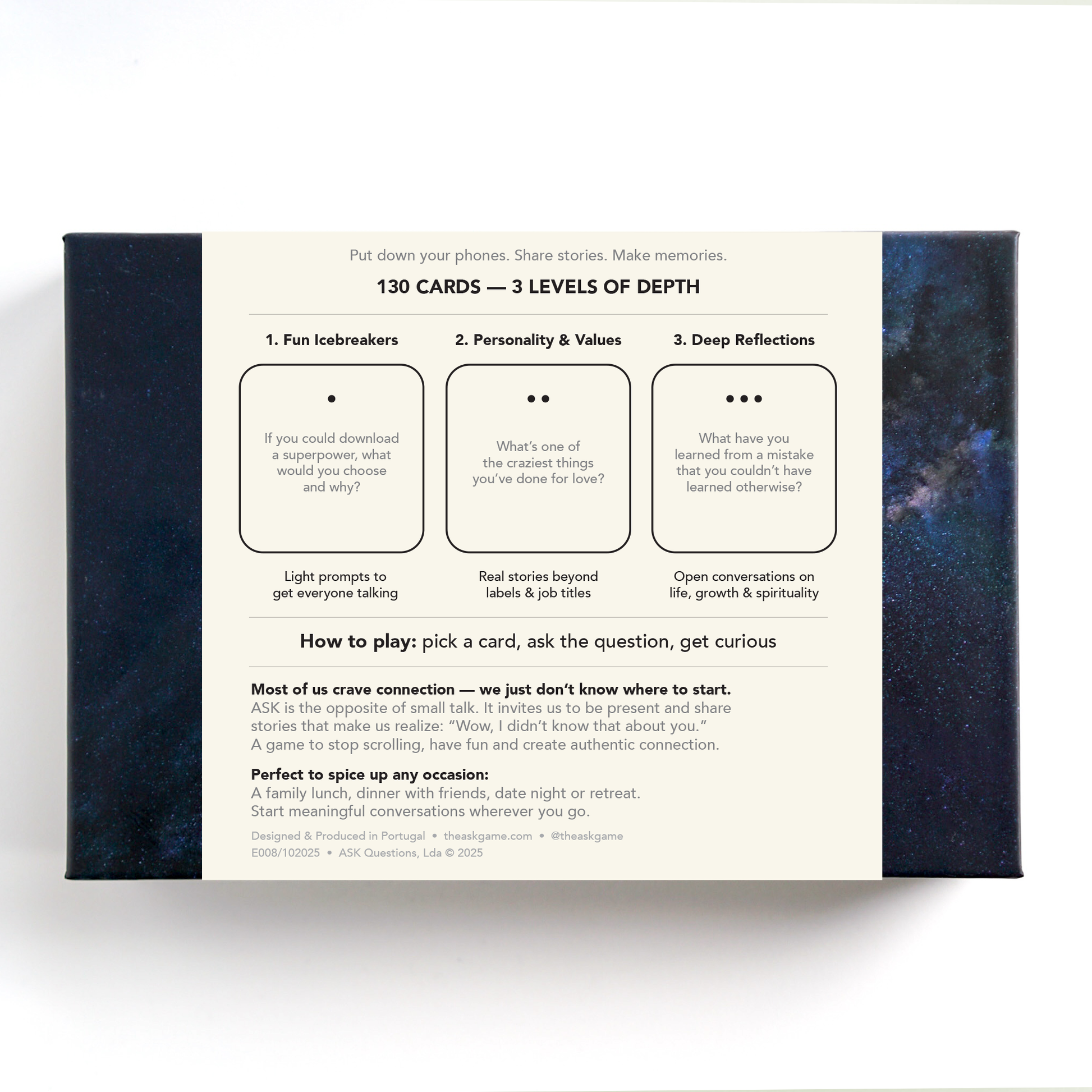 Most of us crave connection — we just don’t know where to start. ASK invites us to be present and share stories that make us realize: “Wow, I didn’t know that about you.” A game to stop scrolling, have fun and create authentic connection.